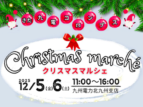九州電力 北九州支店と小倉店 本館6階 きたきゅうコロンブスがコラボし、北九州エリアの生産者、飲食店、作家の方々を応援する地域活性イベント「きた九電コロンブス クリスマスマルシェ」を開催いたします。キッチンカーやイベントたくさんの九州電力株式会社 北九州支店に遊びにきてくださいね。