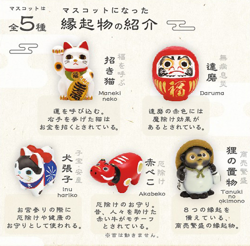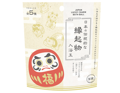 入浴玉が溶けると縁起物のマスコットがどれかひとつ出てきます。入浴玉:1個 550円(全5種)内容量:50g(1回分)