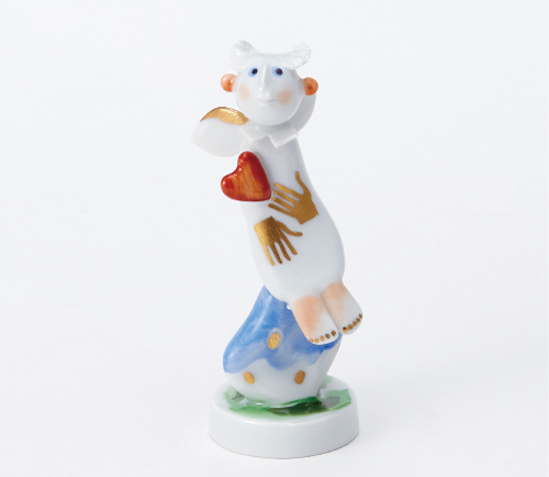 現代マイセンの造形の名手、ペーター・シュトラングの愛弟子、オラフ・フィーバーによる人形です。手びねりの手法を生かし、ハートを胸につけた天使をユーモラスに表現しました。