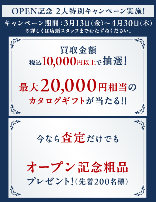 百貨店出店数No.1の総合買取サロン〈タイムレス〉がオープン。オープンを記念して、特別なキャンペーンを実施いたします。専門の査定士が目の前で査定し、どこよりも満足度の高い買取サービスをご提供いたします。お気軽にお越しください。