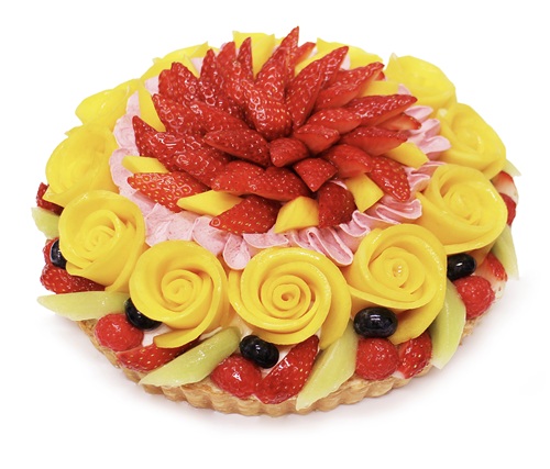マンゴーを美しい薔薇に仕上げ、いちごとキウイと共にカスタードクリームのベースに華やかに飾り付けました。 甘酸っぱいラズベリークリームとの相性抜群な美味しさをお楽しみいただける母の日限定ケーキです。