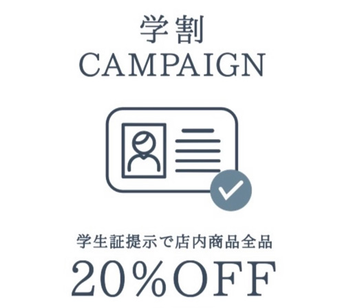山口店2階〈コムサイズム〉におきまして、2026年4月26日(日)まで、学割キャンペーンを開催しております。学生証のご提示で店内商品全品20%OFFにて販売いたします。ぜひこの機会に、ご利用くださいませ。