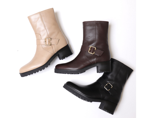 ストレートシルエットのエンジニア風ショートブーツ。しっとりとしたオイル感と艶感が特徴の上質なレザーがデザインを引き立てます。クラス感を感じさせるキレイ目な金具付きベルトも魅力的。厚底ソールなのでカジュアル感がありながらもスタイルアップにもオススメです。