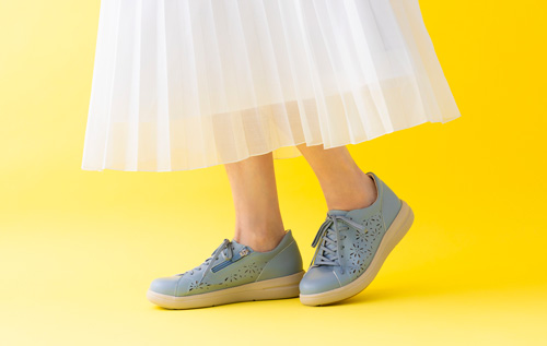 足指ゆったり。春夏にふさわしい涼やか、そして足元には花柄パンチングで華やぐスニーカーです。
