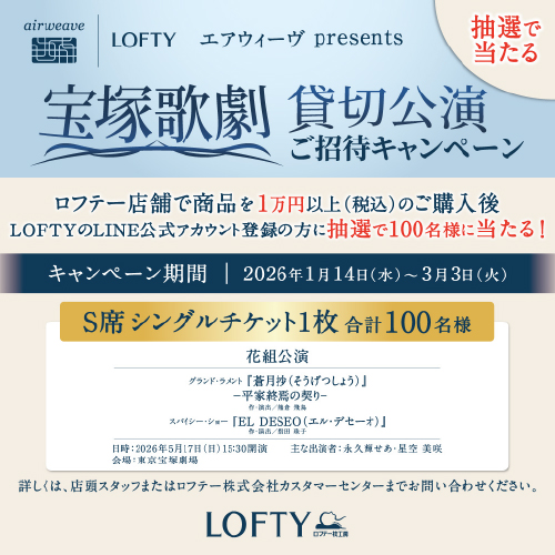 ロフテー店舗で商品を10,000円(税込)以上のご購入後、LOFTYのLINE公式アカウント登録の方に抽選で100名様に当たります。