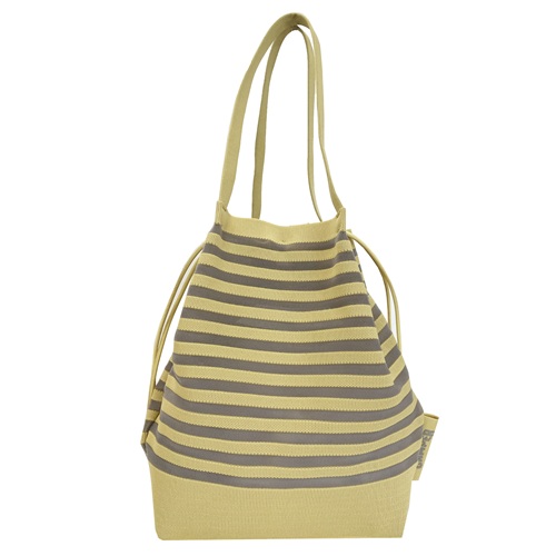 リサイクルポリエステル糸と透明糸をボーダー上に編み上げた清涼感のあるトートバッグです。程よくハリがあり、美しいフォルムを保ちながらも軽量で、通気性にも優れています。中に入れた荷物が透けすぎず、容量もたっぷり入ります。トート型のデザインですが、ドローストリング使用なので、巾着としてもお持ちいただけます。