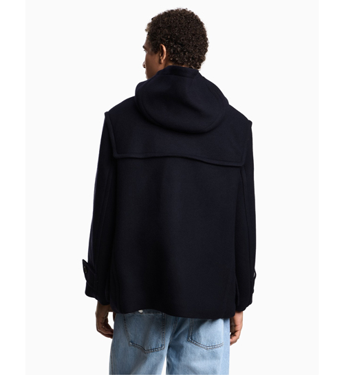 前立ての内側にジップ、外側にクラシックなトグルをあしらったフード付きダッフルコート。ピュアバージンウールのクロスで仕立てています。典型的なトグルの留め具、暖かなフード、大きなパッチポケットをあしらい、メンズワードローブに欠かせないアイテムに仕上げました。寒さから身を守り、冬を通じて着られるコートです。