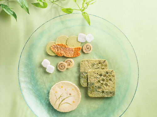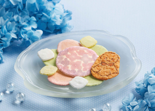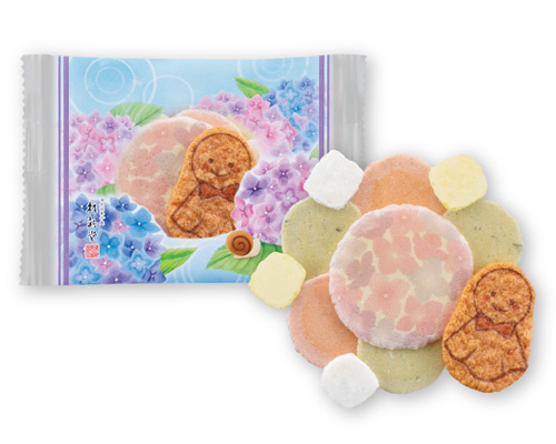 「露にぬれ輝く紫陽花花畑」の情景をモチーフに、口いっぱいにえびの濃厚な旨みが広がる「赤えび炙り焼き」や「梅」「紫蘇」味のえびせんべいの詰合せです。