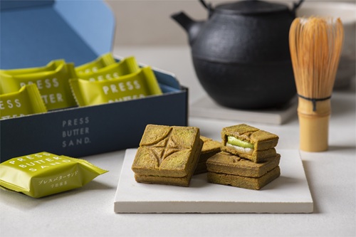 コクのあるバターとの相性を考え、すっきりとした苦味と、香りの良い宇治抹茶を使った緑鮮やかな抹茶バタークリームとバターキャラメルをサンドしたバターサンド。