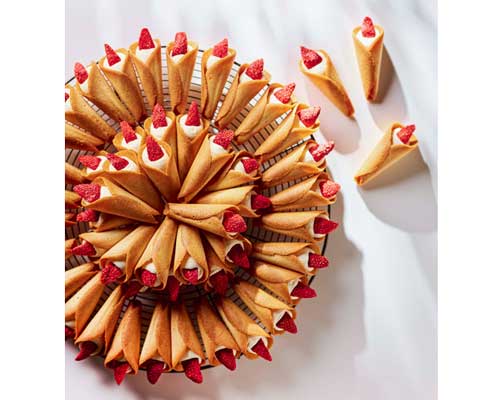 さっくりと焼き上げたラングドシャにホワイトチョコクリームを絞り、フリーズドライの苺をのせました。