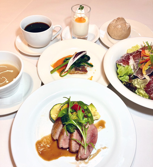 前菜 、生ハムサラダ、スープ 野菜ポタージュ、本日の魚ロースト、鴨ロースト、本日のデザート