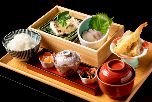 鯛の鉄板焼、貝柱と海老の鉄板焼き又はブリの胡麻醤油のお刺身、天ぷら、ご飯、お味噌汁、小鉢