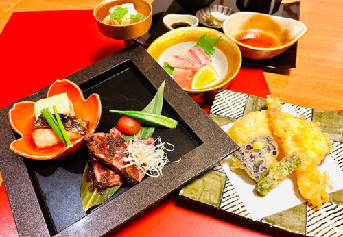 肉料理、魚料理、天ぷら5種盛り、刺身2種盛り、ご飯、みそ汁、デザート