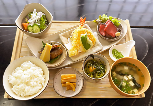 野菜サラダ、天ぷら、煮物、お魚料理、和牛ローストビーフorみらいサーモン、茶そば、ご飯、お味噌汁、お漬物