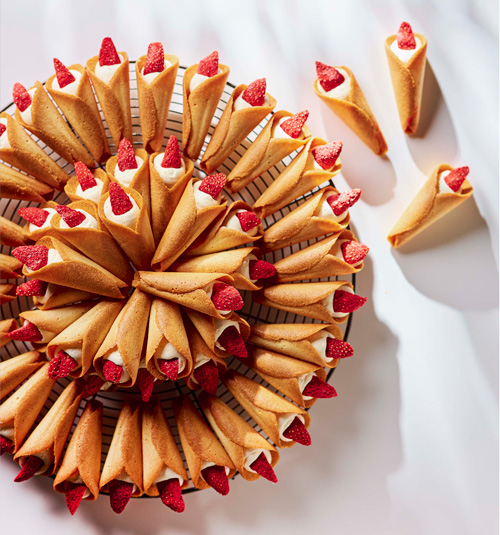 さっくりと焼き上げたラングドシャにホワイトチョコクリームを絞り、フリーズドライの苺をのせました。