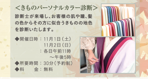診断士が来場し、お客様の肌や瞳、髪の色からその方に似合うきものの地色を診断いたします。