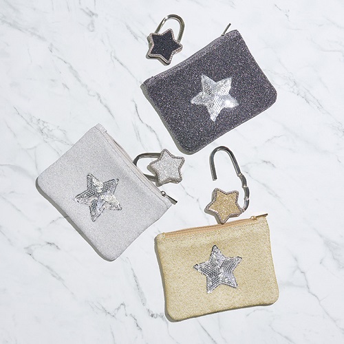 外出先でのお食事シーンやカフェはもちろん、オフィスなどのお仕事シーンでも、バッグの置き場に困ったときにサッと設置可能なバッグハンガーは、眩い星にキュンとしながら大事なバッグにも優しい、まさにオシャレ賢者の便利アイテムです。お揃いカラーのミニポーチとセットで、オシャレと実用性を兼備した、星好きさんも納得のプレゼントに仕上げました。大人の甘辛カラー、ゴールド、シルバー、ブラックの3色から、お好きなカラーをお選びいただけます。ホリデーギフトの+αとしてもおすすめです。なくなり次第終了なので、お見逃しなく!