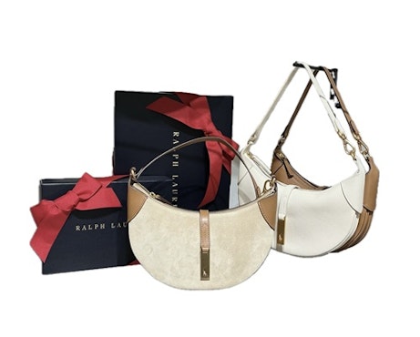 ポロラルフローレンでは定番のイタリア製レザーとスエードのミニショルダーバッグ。ショルダーバッグからクロワッサン型のリストレットへと変形するアイテムです。