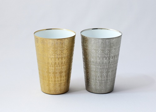 厚さ1ミリ程の極薄素地に新技法であるレリーフ加工にて、立体感のある絵柄を表現しています。更に吹付で金彩と銀彩を施す事でざらつき感と光沢感の異なるテクスチュアを生み出しました。手に取った時に磁器とは思えないほどの薄さと軽さ。香蘭社の丁寧なものづくりの中の洗練された技術を施したタンブラーは、とてもスタイリッシュで現代の暮らしを彩るうつわです。