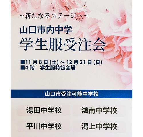 4階学生服売場特設会場にて、新しくご入学を迎えられる方の学生服受注会を開催中です。湯田中学校、平川中学校、鴻南中学校、潟上中学校の4校が対象でございます。新しいステージへの確かな一着を売場スタッフがお手伝いさせていただきます。ご来場をスタッフ一同心よりお待ち致しております。