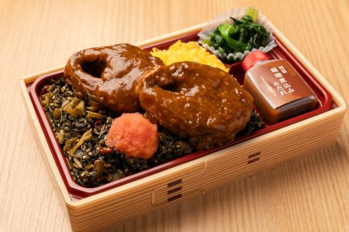 弁当煮魚少年人気No.1。2日かけて煮込んだ鯖の煮込みは骨はほろほろ、味はしみしみです。本店煮魚少年でも人気の高菜の油炒め、博多名物ふくやの明太子を使用し、福岡づくしのお弁当です。特製の味噌煮込みのたれをかけてお召し上がりください。