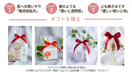期間中〈はるほのか〉の商品を5,000円(税込)以上ご購入された方に「700円相当の石鹸(15g)」をプレゼントいたします。ぜひこの機会に1階エクラナチュレにお立ち寄り下さいませ。