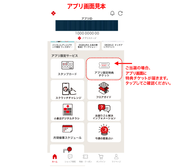 ③ご当選の場合、お買い物券引換チケットが発行されます。アプリTOP画面の「アプリ限定サービス アプリ限定特典チケット」をご確認ください。
