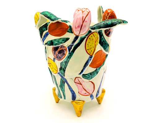 伝統的陶技を背景に、シュルレアリスムやフェミニズム、ポップアートの感性を融合。女性の身体の一部をモチーフにした造形と東アジア磁器の文様を組み合わせ、装飾や「器」の概念を軽やかに覆す。伝統と現代、ユーモアと批評が響き合う、松田百合子の独創的な陶の世界をお楽しみください。