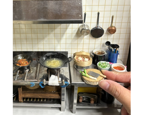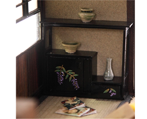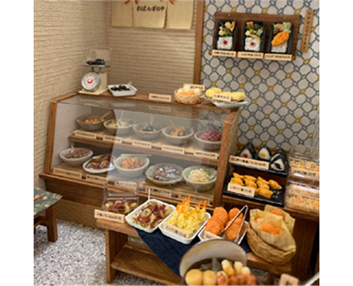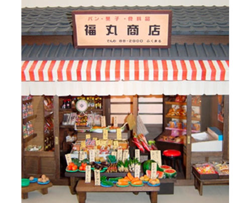 なんでも屋さんや昔懐かしいお店をはじめ、和をテーマにした生活感がある作品。額装にして飾りやすいミニチュアが中心。