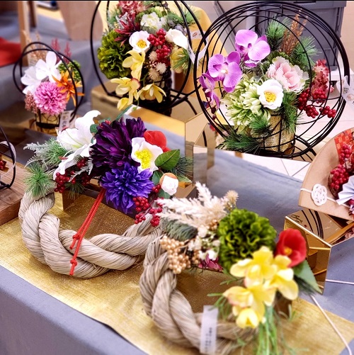 アーティフィシャルフラワーを使用したお正月飾りを伝統的な美しさでポップなデザインにアレンジしました。華やかで鮮やかな色合いとモダンなデザインで、新年を明るく彩ります。