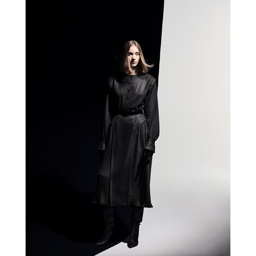 コンパクト感のあるウールヴィスコースナイロンツイルとウールポリエステルボイルプリーツ。上品な光沢、ソフトな風合いに軽やかなプリーツを合わせてジュンアシダならではの美しいシルエットを演出いたします。