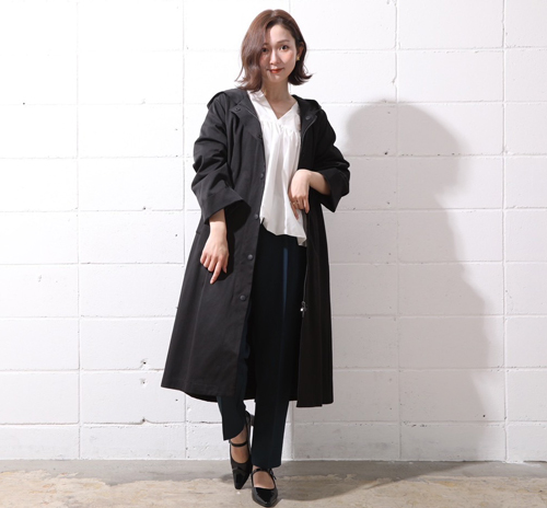 バックタックがすっきり見えするフード付きコート。オンにもオフにも使いやすく、長いシーズン着用できます。