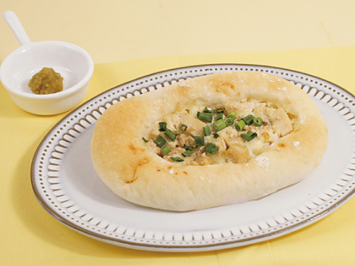 もちもちの生地に、柚子胡椒を効かせた蒸し鶏をのせて焼きあげました。仕上げのゴマと万能ネギがアクセント。