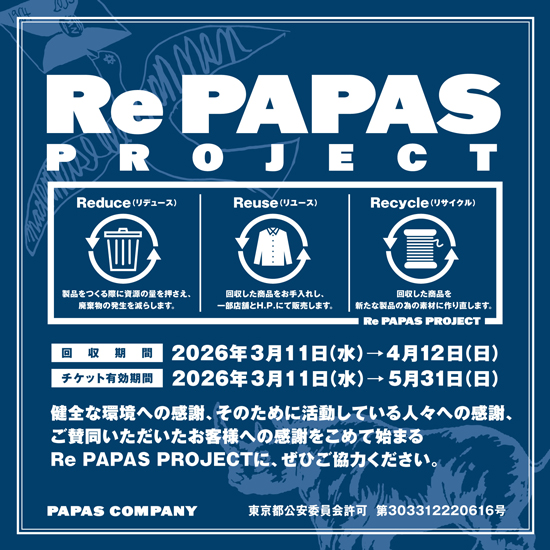 ご愛用いただいている〈パパス〉〈マドモアゼルノンノン〉の製品を対象ショップにお持ち込みいただき、それらを再生して新しい製品のための素材にリサイクルします。期間中、お持ち込みいただいた製品1点につき1,000円分のお買い物チケットと交換させていただきます。お買い物チケットは小倉井筒屋〈パパス〉〈マドモアゼルノンノン〉にて11,000円(税込)以上のお買上ごとに1枚ご利用いただけます。