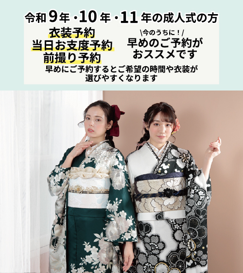 令和9年・10年・11年の成人式の方、衣装予約・当日お仕度予約は今のうちに!早めのご予約がおススメです!早めにご予約するとご希望の時間や衣装が選びやすくなります!見学・ご相談だけでもお気軽にお越しください。