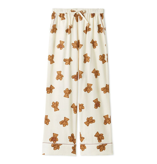 コットン、レーヨン混の温かみのあるネル素材を使用したやわらかいロングパンツ。脚のラインを拾わないストレートシルエットで、ゆったりとした着心地です。大きめのベアの総柄プリントがポイント。