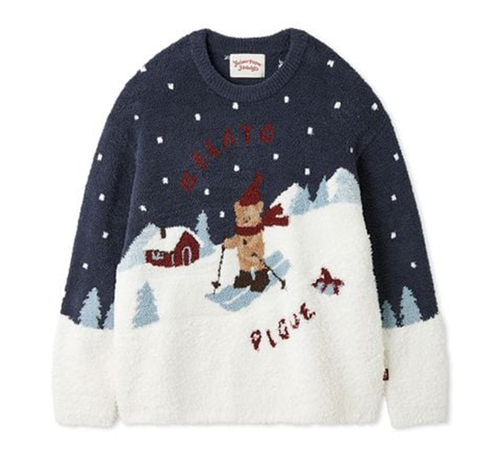雪山をスキーして、大切な人にプレゼントを運ぶベアをパネルで大胆に表現したプルオーバー。雪の部分には毛足の長いジェラートの糸を入れ、質感豊かな仕上がりに。赤いマフラーとニットキャップを身に着けたベアの表情や、ストーリー性を感じさせる背景の絵柄にもこだわったスペシャルな一枚です。