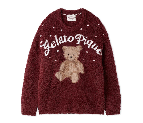粉雪舞うスノーベアのふわもこプルオーバー。毛足の長いジェラート素材を使用したゆったりシルエットです。座っているベアの周りに舞っている雪と、肩まで大きく入ったキャッチーなロゴがポイント。