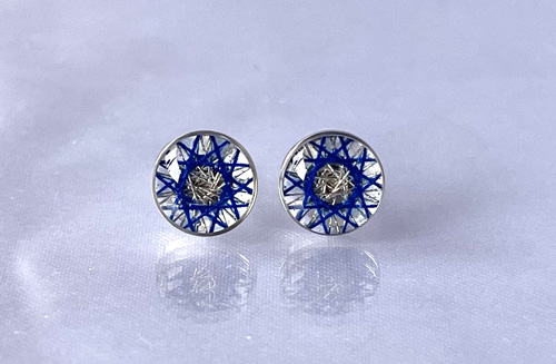 1つ1つ糸をかけて作った糸かけ曼荼羅のアクセサリー(意匠登録済商品)。耳飾りの中でも1番小さい8mmサイズ。
