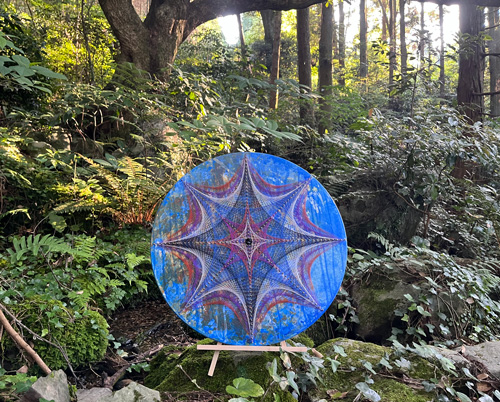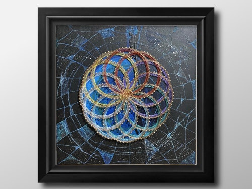 糸かけ曼荼羅と抽象画を融合させたオリジナルアート。自然の中にある形や色、自ら感じたものを色と糸で表現しています。タイトルは「earth」。