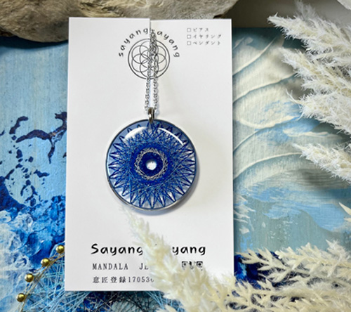糸かけ曼荼羅の技法で1つ1つ丁寧に糸を掛けて作った〈sayang sayang(サヤンサヤン)〉オリジナルのペンダント。深いブルーの糸が描く美しい模様は、心を静かに整えてくれるような存在です。特許庁に意匠登録(第1705368号)