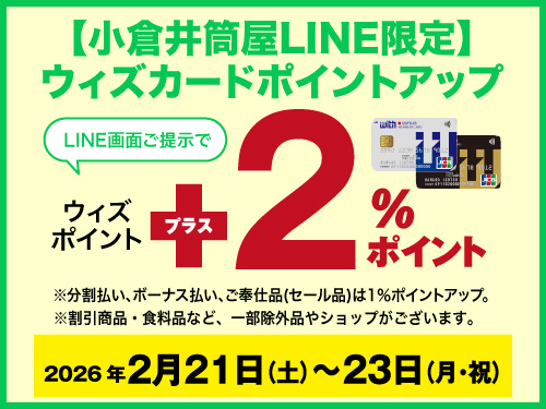 ※ウィズカードポイントアップは2026年2026年2月21日(土)~23日(月·祝)の期間内に新規ご登録の方、 2月20日(金)以前に小倉井筒屋LINE公式アカウントをご登録の方が対象です。