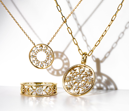 太陽・月・星の天体モチーフをあしらったスタージュエリーのアイコンデザイン。繊細なディテールで象られた天体のモチーフに、きらびやかなダイヤモンドを贅沢にちりばめて、ラグジュアリーに仕上げました。