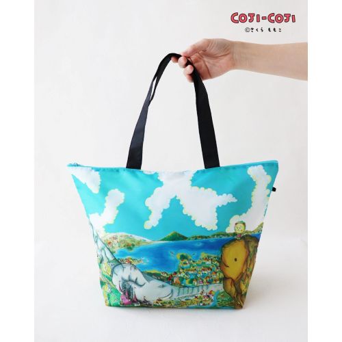 ファスナー付きのエコバッグ。持ち運びの時にはコンパクトに畳めて便利なゴム付きです。扉絵のメルヘンの国の全景イラストと、住人達が散りばめられた大人も日常使いで楽しめるデザインの2柄を展開します。旅行や日常の急に荷物が増えた時などのサブバックとしてもおすすめです。