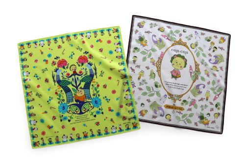 コジコジとメルヘンの国の住人達の日常を連想させるユーモラスな一枚。思わず広げたくなるデザインですので、ランチタイムのちょっとしたお楽しみに、お弁当包みとしてもおすすめです。それぞれの柄の中央に英字で描かれた意味にも、ぜひご注目いただきたい一枚です。
