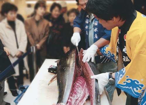 2025年10月10日(金)午前10時30分より、本館地階鮮魚丸福売場にて整理券の配布を行います。解体ショー(約20分間)終了後、商品の販売になります。