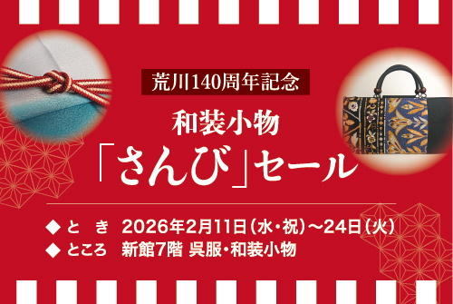 創業140年の歴史を誇る京都・室町の老舗和装小物メーカー「荒川」が日頃のご愛顧に感謝いたしまして、一堂に特別価格にてご提供いたします。ぜひこの機会にご来店くださいませ。