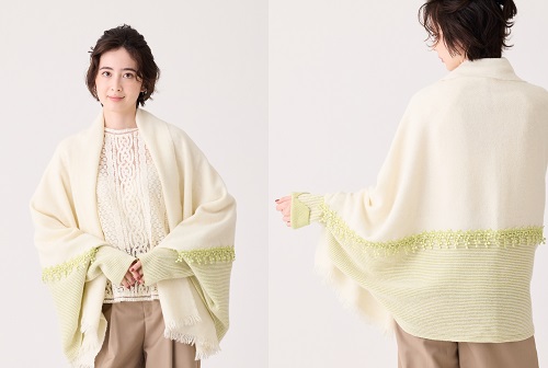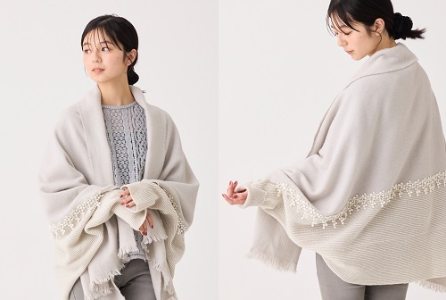 近沢レース店の秋冬の定番的アイテム!1枚あるととても便利な袖付きショール。動くたびにゆらゆら揺れる存在感のあるレースをセレクトいたしました。たわわに実る果実のようなレース、上品な光沢感がバッグスタイルを美しく彩ります。袖口にスリットが入っており、丈の調節がしやすい工夫を施しました。サイズフリーなので、秋冬シーズンのギフトとしておすすめいたします。