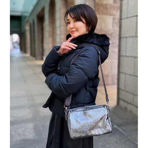 さりげない迷彩柄が上品な、コンパクトポシェット。メインには350mlのペットボトルや長財布がしっかり入ります。