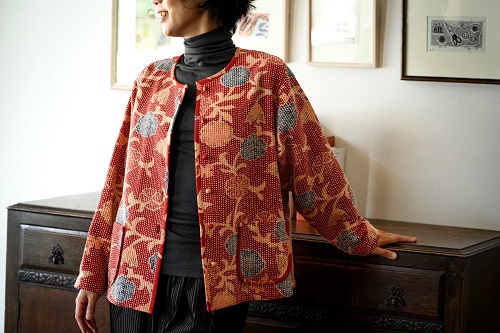 柔らかなシルクに一目ずつ刺し子をしたJAPANモダンなブルゾンです。今回ノーカラージャケットを限定価格にてご案内です。